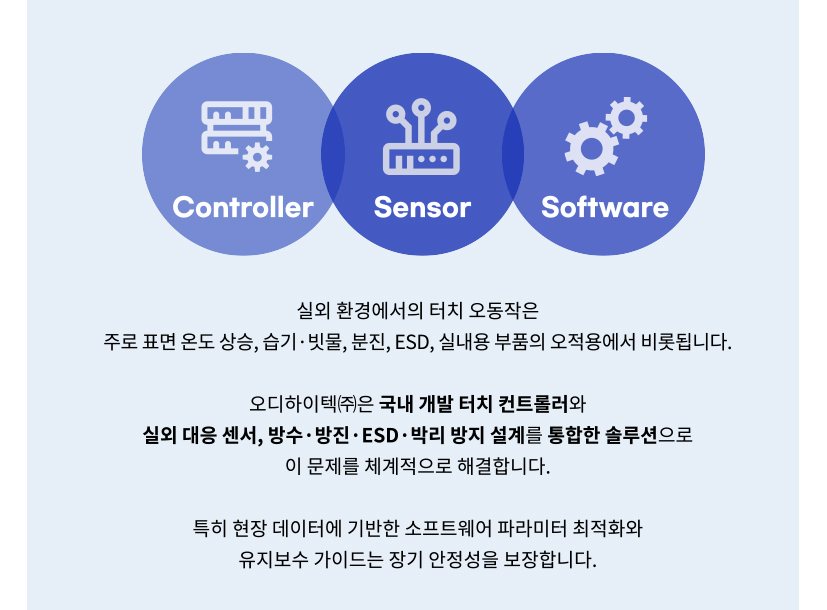 실외 환경에서 발생하는 터치 미동작·오동작의 원인과 오디하이텍의 국내 개발 컨트롤러 기반 해결안을 소개합니다.